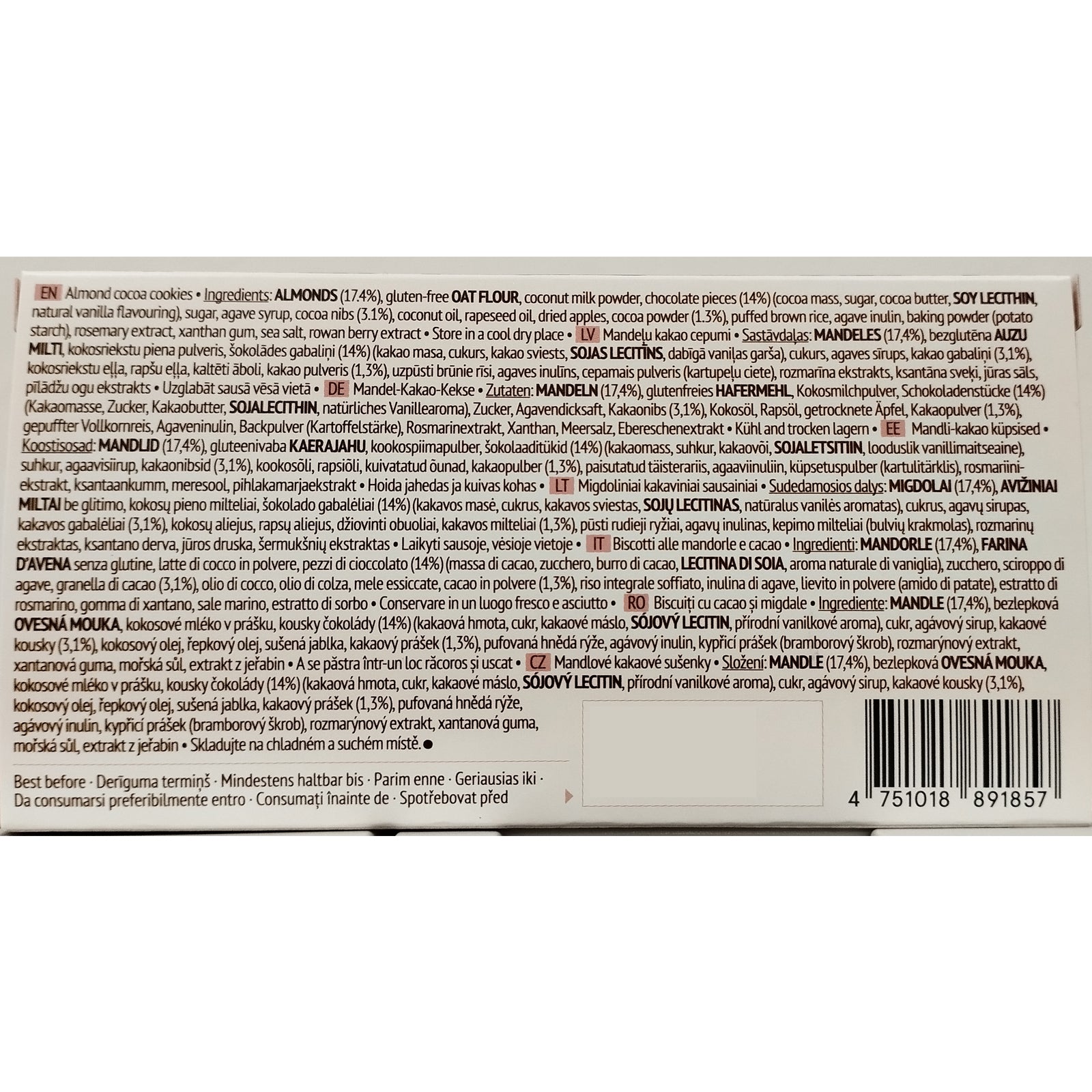 Ingredients: Almonds 15%, buckwheat flour, coconut milk powder, coconut sugar, agave syrup, chocolate pieces 7 % (sugar, cocoa mass, cocoa butter, cocoa powder, vanilla), cocoa nibs 5%, rapeseed oil, coconut oil, sublimated apples, cocoa powder 1,5%, amaranth puffed, baking powder (potato starch), xanthan gum, sea salt.