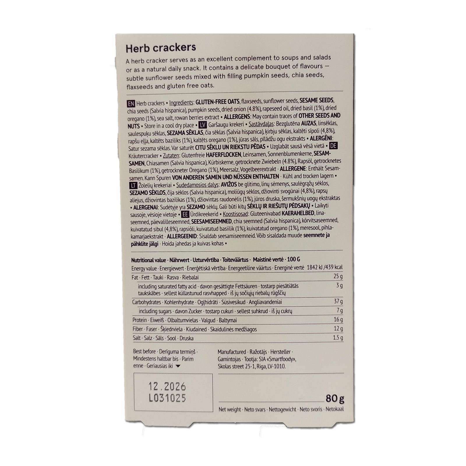 Ingredients: oats gluten free, flaxseeds, sunflower seeds, onion 8%, sesame seeds, chia seeds (Salvia hispanica), pumpkin seeds, rapeseed oil, basil 1%, oregano 1%, sea salt.